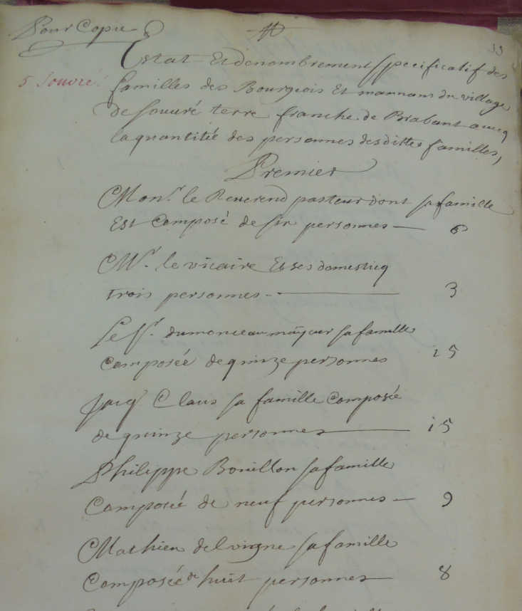 Estat et denombrement specificatif des familles des bourgeois et mannans du village de Souvré, terre franche de Brabant, avecq la quantité des personnes des dittes familles